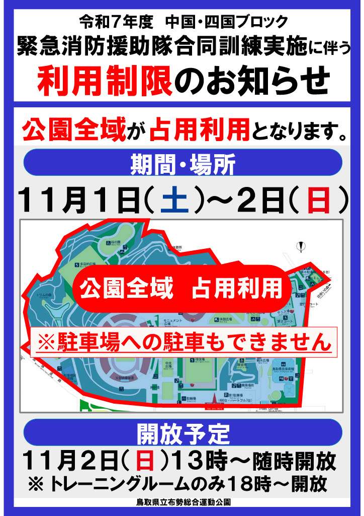 お知らせ総務部 【重要】消防援助隊合同訓練に伴う使用制限 2025.10.25 ヤマタスポーツパーク陸上競技場の施設管理者より、11月1日(土)・2日(日)の施設利用制限に関する告知がありました。 詳細な情報は、ヤマタスポーツパークHP、又は下記の告知資料(PDF版)をご確認ください。 ヤマタスポーツパークHP(リンク先) 告知資料(PDF版)